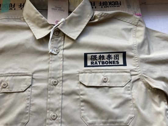 ●これからの季節に大活躍なタウン着になること間違いなしなワークシャツ!。カラーはベージュ、ブラック、オフホワイトをご用意!左胸に猥雑楽団のプリントパッチを縫製、ベージュとオフホワイトのバックプリントは黒色、ブラックボディのバックプリントは薄めの白プリントです。左胸に猥雑楽団RATBONESのフェルトにプリントしたパッチを縫製してます。
