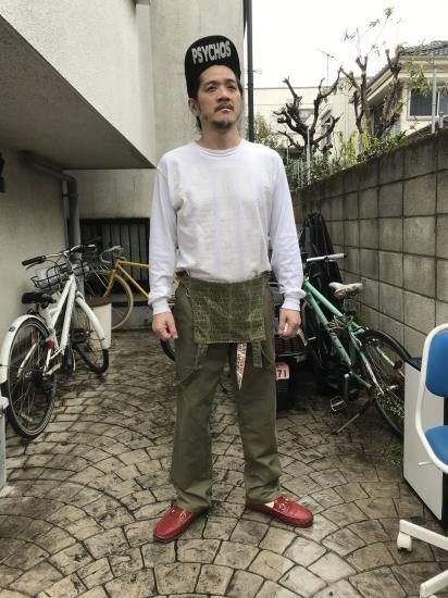 ●ヨーロッパのビンテージ・ミリタリーからサンプリングしましたオーバーオールです!素材は密度の高い倉敷の国産アーミーコットンを使用!もちヘリンボーンです!前身頃の裏地とストラップにはFUCKOFF柄を使用しベルトループにベルトを通せば前身頃をダラーンとたらしてワイルドに主張!。前右側にはDカンもついているのでチェーン付きの財布も無理なく使用できます。やや細身の型で、前身頃の腹ポケット部分は胸上位置ではなく胸下位置と解釈してもらった方がしっくりきますが、調整ボタンで好きな位置にもできます!。股上も多少深くカスタムしましたので上下の位置は10センチ〜15センチで好きな感じが楽しめます。モデルは170センチ、見事な中年体系でMサイズを着用。