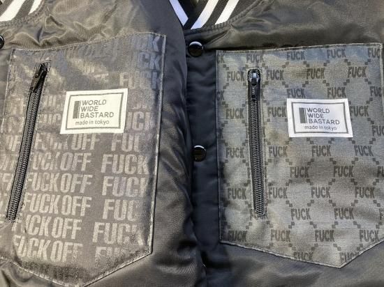 柳家商店オリヂナル!WWB(ワールド・ワイド・バスタード)のFUCKOFF柄ポケットがついたスタジャンの登場です!シルエットもしっかりと80s〜90sライクなシルエットですのでその筋の方も安心して着てください!黒×黒FUCKOFF柄ポケットもしくはムッチ柄FUCKポケットのどちらかが選べます!さりげなく反抗!大人の反抗期はぜひWWBのスタジャンを着用してください!リブは白黒です。ちなみに170センチの方でSサイズはピタピタな感じでMサイズは普通って感じです好みですが雰囲気は多少変わります。