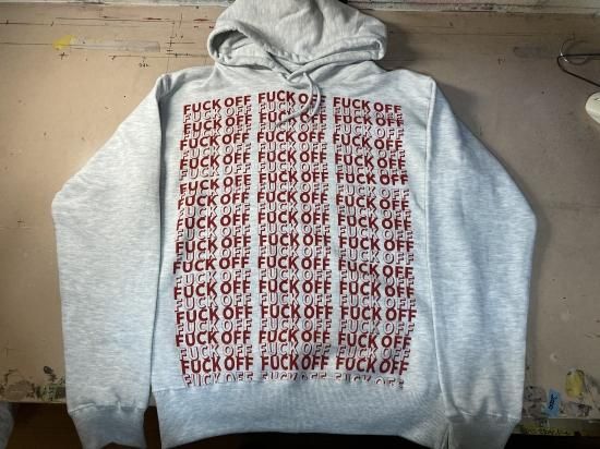 新しいFUCK OFFパターンです!画像はアッシュに赤プリントです。ポケットレスで前面にプリントが可能になりました!プリントカラーは全て赤プリントです